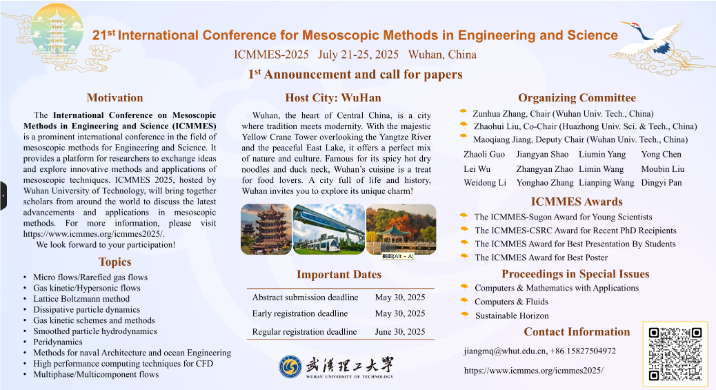 第21届工程和科学中的介观方法国际会议(ICMMES 2025)即将于2025年7月21日至25日在湖北武汉召开,会议由武汉理工大学主办,博彩平台排名 承办,华中科技大学和宁波东方理工大学协办。