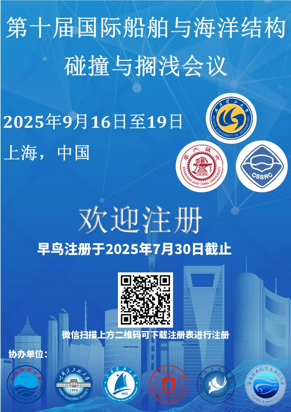 第十届国际船舶与海洋结构碰撞与搁浅会议(ICCGS 2025)将于9月16-19日召开。国际船舶与海洋结构碰撞与搁浅会议(ICCGS) 自1996年在美国旧金山创会以来, 每三年召开一次, 会议出版的论文集多次被EI 收录。 本次会议首次在国内举办,由武汉理工大学、上海交通大学、中国船舶科学研究中心共同主办, 武汉理工大学朱凌教授担任会议主席。本次会议的分会场和报告数量均创历史新高,国内早鸟价优惠截止至7月30日,欢迎大家的参加!