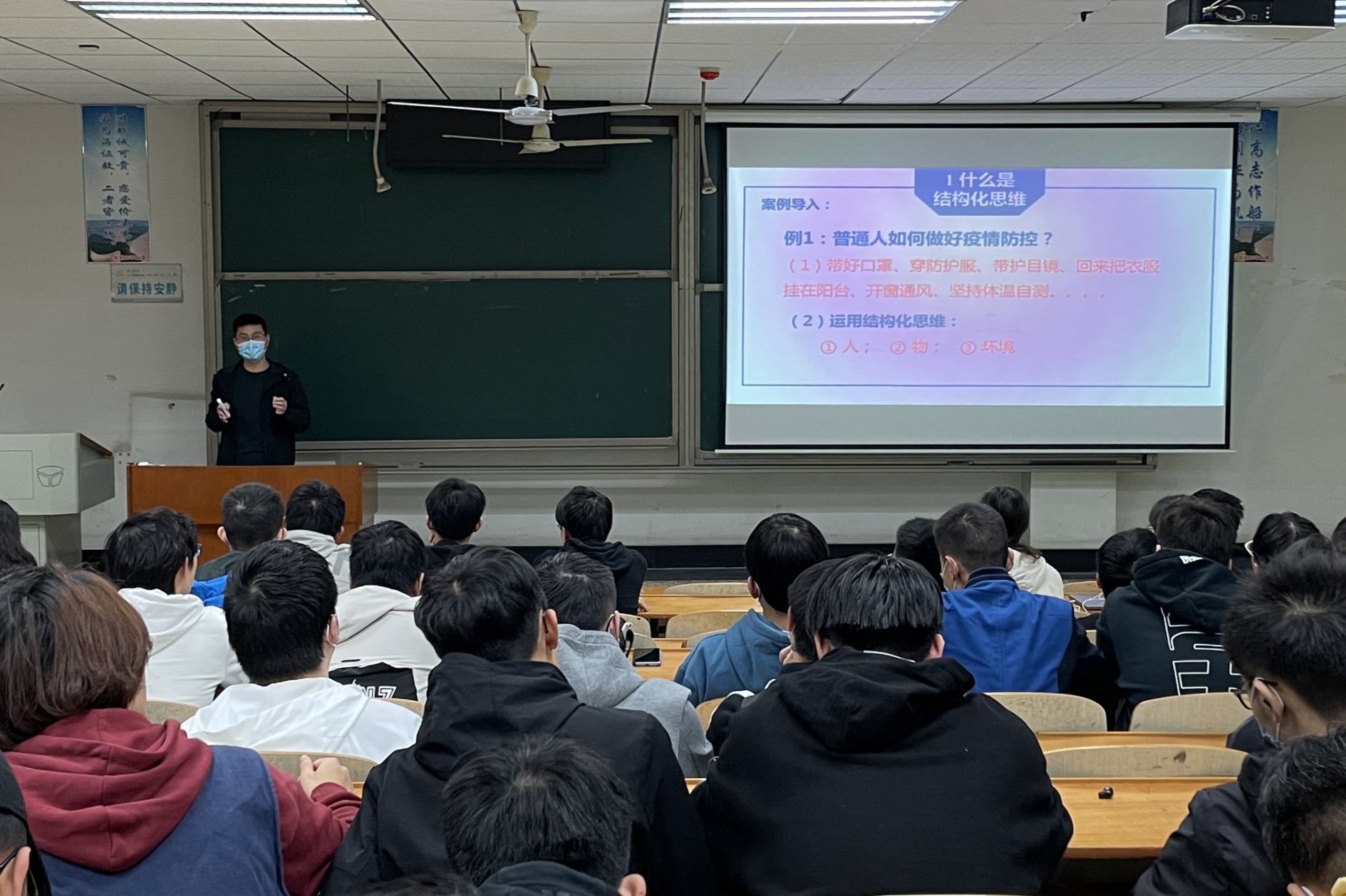 宋老师首先以“普通人如何做好疫情防控”为例,以课堂互动的方式,引导在场学生认识结构化思维,并为大家介绍了结构化思维的本质和结构化思维的作用。他讲到,结构化思维其实就是让思维从无序到有序的过程。宋老师建议大家今后在汇报工作、写年终总结、制做简历、回答问题和面试等时候,都可以运用结构化思维。