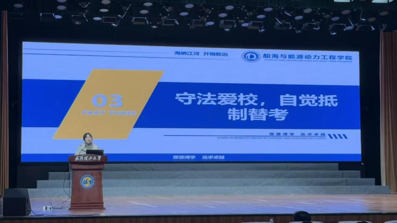 潘玟竹结合校园安全管理重点与学业规范要求开展专题分享。消防安全方面,提醒同学们在实验室及日常活动中需强化防火防电意识,规范用电行为,杜绝安全隐患。考风考纪教育方面,潘玟竹强调,课程考核需秉持诚信原则,不可触碰校规校纪红线;尤其是国家级考试,替考、组织作弊等行为已纳入法律规制范畴,将面临相应的刑事追责,严重影响个人未来发展。最后呼吁同学们树立正确的考试观念,珍惜求学机会,共同维护公平公正的学术氛围。