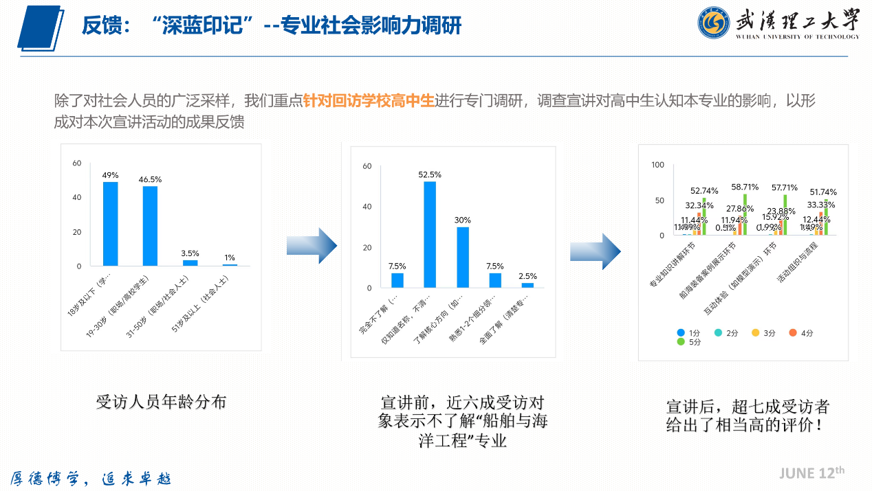 调研数据显示,宣讲前近六成受访高中生对船舶与海洋工程专业完全不了解,宣讲后超七成受访者对专业给出了较高评价,专业认知度与学习兴趣度均实现显著提升,其中船模互动演示、海工装备案例展示等环节获得了受访群体的高度认可。本次调研报告不仅以量化数据直观呈现了团建项目的实施成效,也为团支部后续优化活动形式、深化育人内涵提供了科学的参考依据。