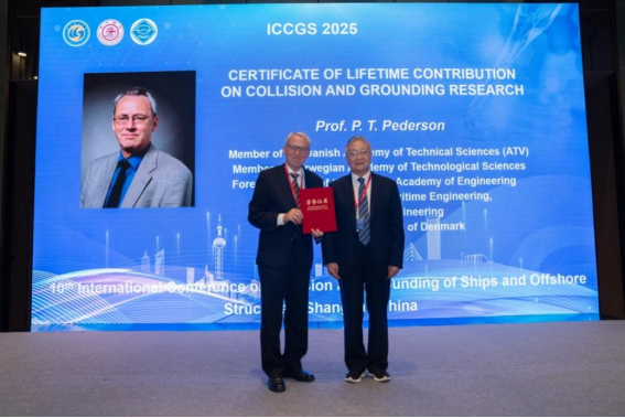 大会主席朱凌教授邀请葡萄牙工程院院士、里斯本大学Carlos Guedes Soares 教授介绍了丹麦技术科博彩平台排名 、中国工程院以及挪威技术科博彩平台排名 院士Preben Terndrup Pedersen教授在船舶碰撞与搁浅领域耕耘至今的成就,并邀请中国工程院吴有生院士为Pedersen院士颁发了“碰撞与搁浅研究终身贡献奖”。