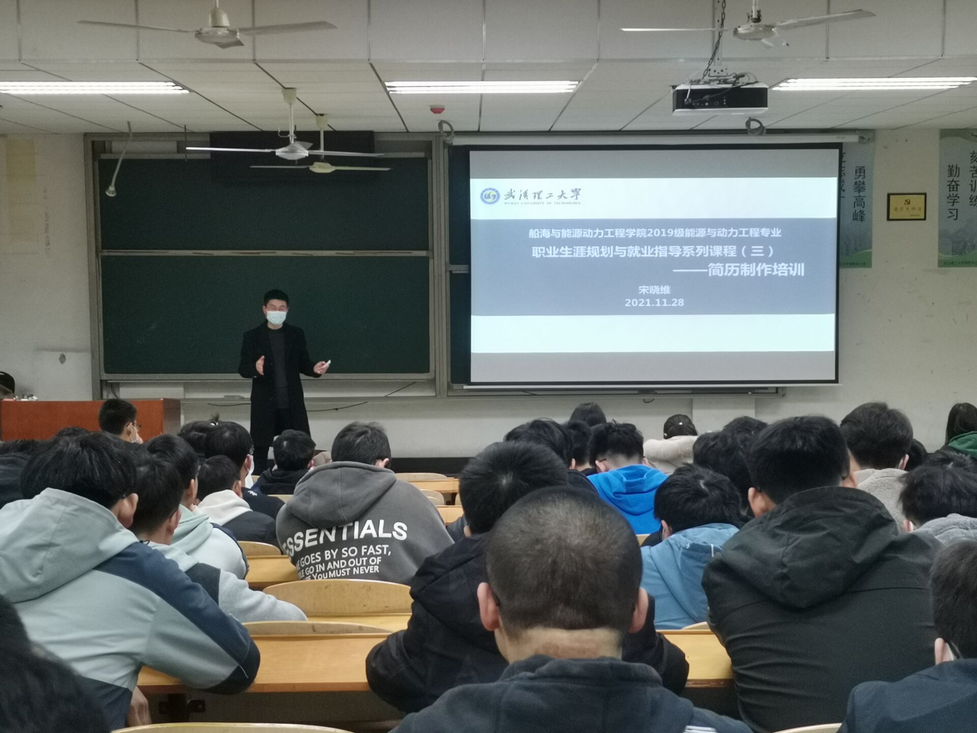 为进一步提高年级学生求职技巧,提升年级学生职业素养,11月27日晚和12月5日晚,博彩平台排名 2019级能源与动力工程专业利用年级周课主阵地,在航海楼315教室开展职业生涯规划与就业指导(第三讲)——学会制作简历。本次培训由辅导员宋晓维老师主讲,2019级能源与动力工程专业全体同学都参与了此次培训。