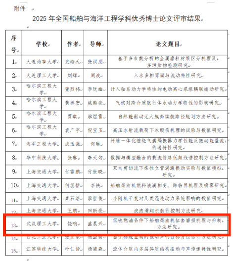 近日,中国造船工程学会2025年全国船舶与海洋工程学科优秀博士学位论文评选结果揭晓,全国共评选出优秀博士学位论文15篇。十大博彩平台排行榜 饶响博士(导师:盛晨兴教授)的学位论文成功入选。