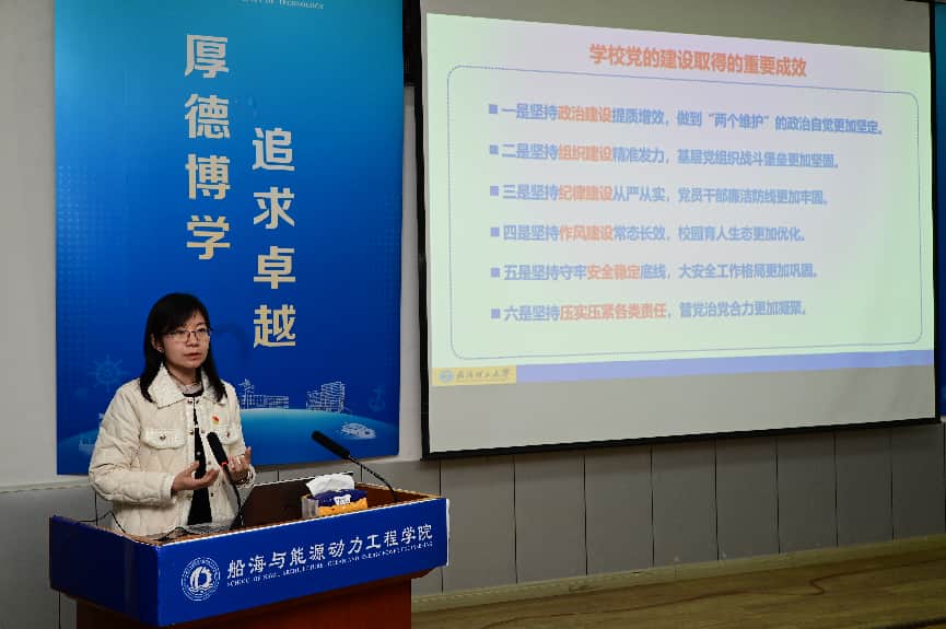 博彩平台排名 党委副书记、学生党总支书记李春梅传达学校党建工作会相关精神,就新学期学生党建工作进行全面部署。李书记指出,要坚持政治引领,强化政治功能,扎实开展树立和践行正确政绩观学习教育,认真落实“素养提升、安全意识、爱校荣校”三项教育,持续巩固基层党组织思想政治根基;要夯实组织基础,规范党员发展全流程工作,从严强化学生党员纪律要求,筑牢纪律防线;要深化融合机制,紧密对接“十五五”规划首次写入“建设能源强国”和习近平总书记强调“推动海洋经济高质量发展”的战略契机,探索把党支部建在重大项目组、科研平台、导学团队上,实现师生党支部与行业企业“支部共建”全覆盖,推动党建工作与学科建设、科研创新深度融合;四是聚焦品牌提升,依托博彩平台排名 办学80周年契机,深化“三船文化”与“轮机精神”的传承与创新,推进“一支部一特色”建设,培育具有博彩排名 特色、辨识度高的党建品牌。