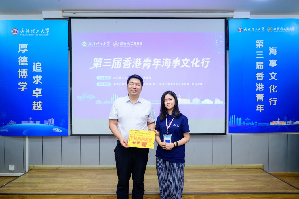黄伟代表海事文化行师生向学校表示感谢。他指出,海事文化行活动是香港青年学子体验中华传统文化、见证国家科技发展成就、接触高校船海课程的重要平台,也是推动海事文化传承与创新的重要契机,希望参加学子们能珍惜机会,恪守安全准则、尊重多元文化习俗,以谦逊之心学习,将活动期间所见所闻转化为对国情的深度认知、对文化的真切感悟,进一步筑牢文化自信之基,深化国民身份认同,成为“有担当、有视野、爱国爱港爱家”的终身学习者。